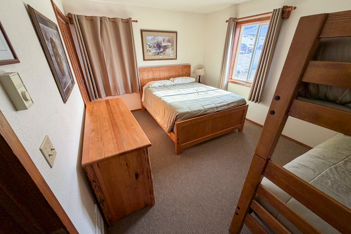 The Bunsen Cabin accommodates 6-8 guests, 1.5 bathrooms, 2 bedrooms: both with a queen bed and a twin over twin bunkbed.
