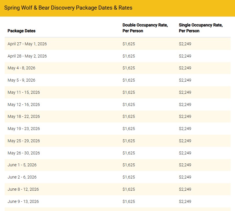 The Spring Wolf & Bear Discovery package focuses on wolves and bears in Yellowstone National Park. Both elusive species occupy important roles on the landscape and in our imaginations. Each day, you will visit strategic viewing locations along Yellowstone’s famous northern range and discuss the biology, ecology, and research surrounding these fascinating creatures. We will also take advantage of opportunities to observe and discuss other wildlife and their role in the ecological fabric of Yellowstone.