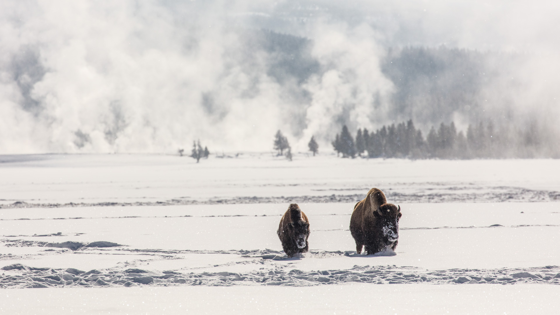 Wildlife: Bison plowing through snow, elk grazing in frosty meadows, and wolves across the northern range and in Hayden Valley. All wildlife is more visible in winter against the snow-covered landscape.